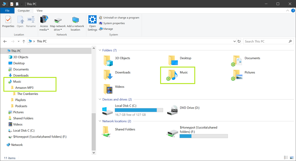 Da der Ordner Music (oder Musik auf einem Windows mit deutscher Sprache) zum Benutzer-Profil gehört, kann dieser über eine Gruppenrichtlinie oder manuell umgeleitet werden, seine Position im Dateisystem damit verändert werden. Früher hatte ich alle Ordner auf den Server umgeleitet, habe das aber aufgrund von vielen Programmen (Adobe) welche mit umgeleiteten Applikationsdaten (AppData) Probleme haben auf die folgenden Ordner reduziert.