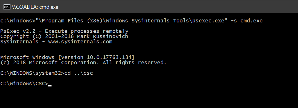 c:\Windows> "\Program Files (x86)\Windows Sysinternals Tools\psexec.exe" -s cmd.exe