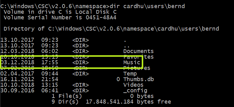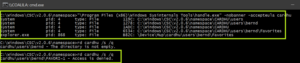 Damit ist ein Zugang zum CSC Ordner möglich, in dem sich zwei Namespaces befinden. Neben dem aktuellen auch der im Process Monitor angezeigte alte.