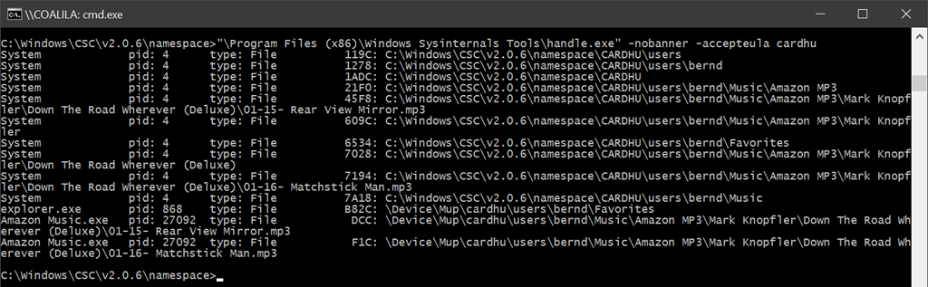 Mittels eines weiteren Tools aus der Sysinternals Suite konnte ich die Verwendung des Ordners durch die Amazon Music App weiter analysieren. Handle zeigt, dass Amazon Music einige Ordner und Dateien verwendet.
