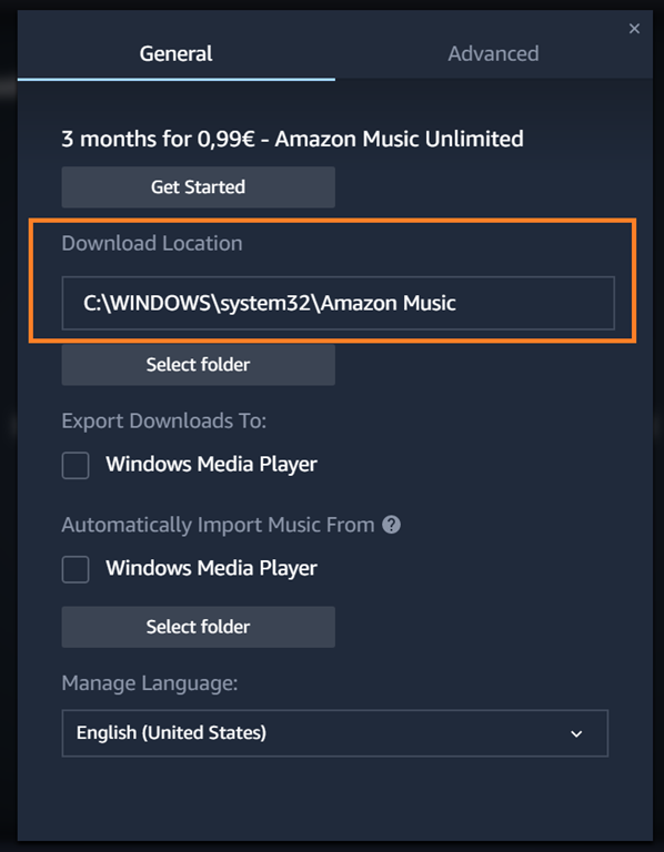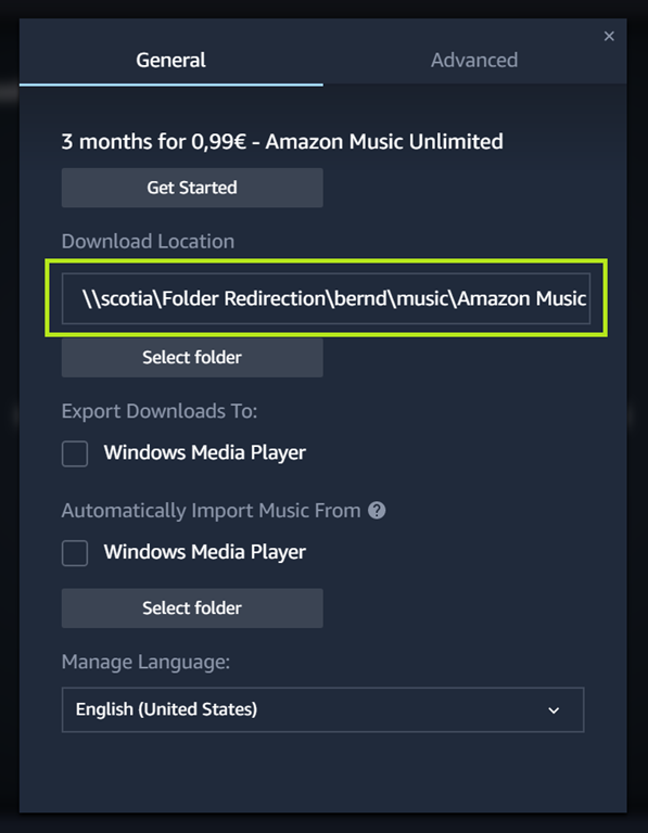 Die neu installierte App war dann zwar der Meinung, dass C.\Windows\System32\Amazon Music der richtige Download Ordner wäre, was man aber in den Preferences/Einstellungen korrigieren kann.