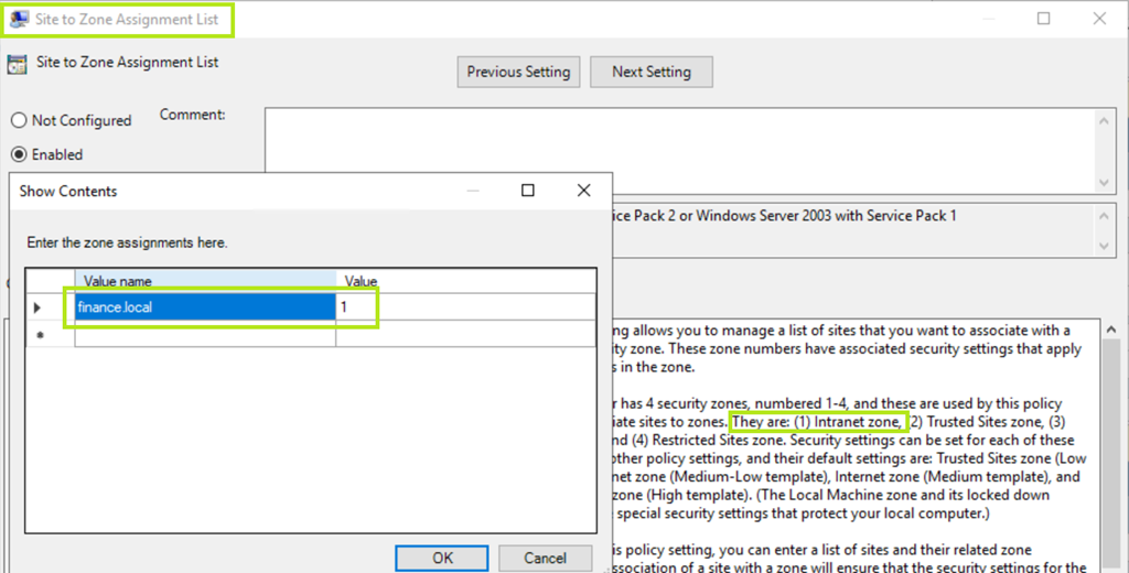 In die Site to Zone Assignment List kann man mehrere Werte, IP-Bereiche usw. eintragen. Denkbar wäre zusätzlich nur “finance” falls es jemanden gibt der mit \\finance\dfs\freigabe anstatt \\finance.local\dfs\freigabe arbeitet, was zwar nicht sinnvoll aber möglich ist.