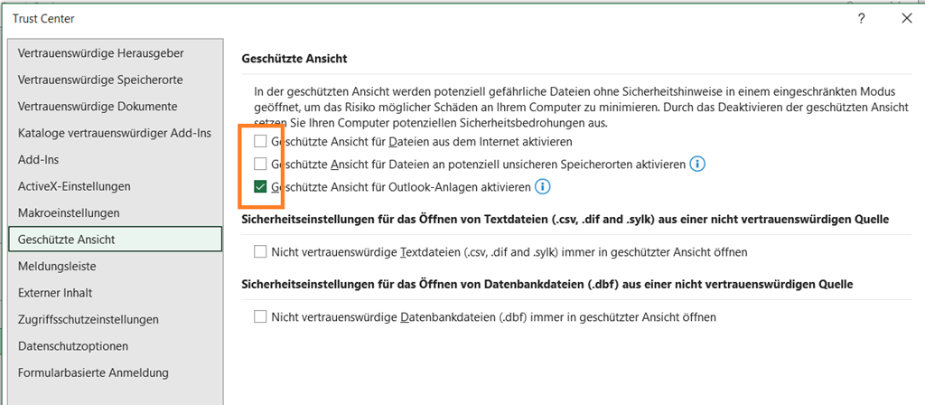 Im Internet kursieren eine Reihe alternativer Workarounds, wie zum Beispiel das Aufweichen der Sicherheitseinstellungen in Excel / Office wie im folgendem Screenshot zu sehen ist.
