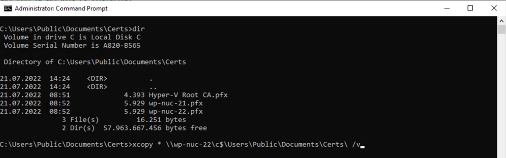 - Insgesamt werden n+1 (N = Anzahl der Hyper-V Hosts die an der Replikation teilnehmen) Zertifikate erstellt. Für jeden Hyper-V Host eines (das Server-Zertifikat) und das Root-Zertifikat. Bei zwei Hosts, haben wir damit drei Zertifikate