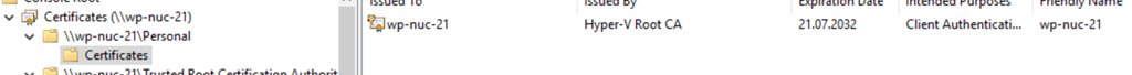 - Während das Root-Zertifikat auf jedem der Hyper-V Hosts installiert wird, bekommt jeder Host ein eigenes Server-Zertifikat