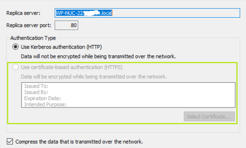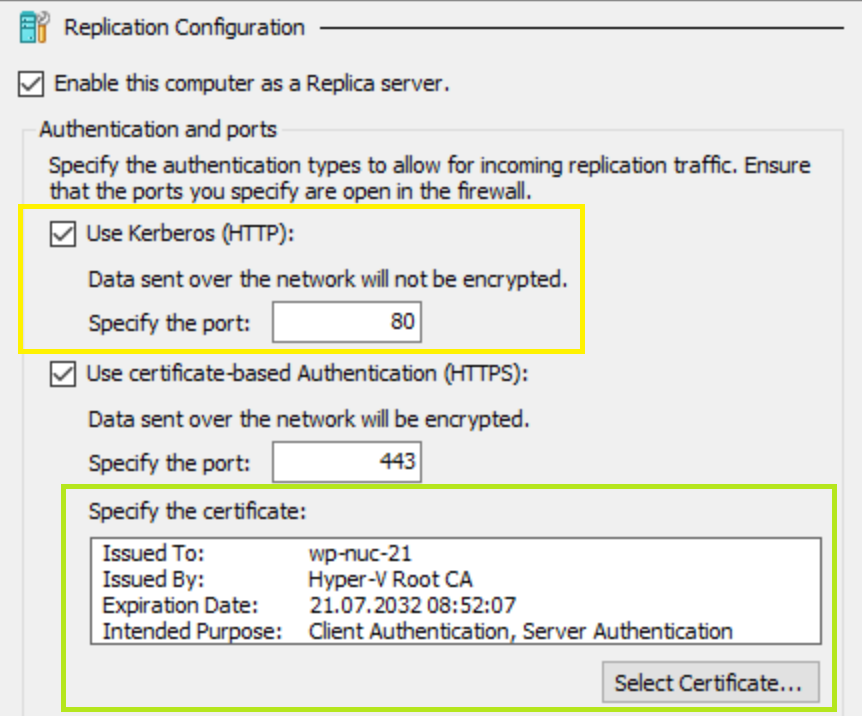 Damit sollte die Hyper-V Replikation eigentlich funktionieren – tat sie aber nicht. Zusätzlich zur certificate-based Authentification (HTTPS), musste ich auch noch die Verwendung von Kerberos (HTTP) aktivieren! Warum, kann ich nicht genau sagen und muss hier nochmals mit einem Netzwerk-Trace, der Sache auf den Grund gehen.