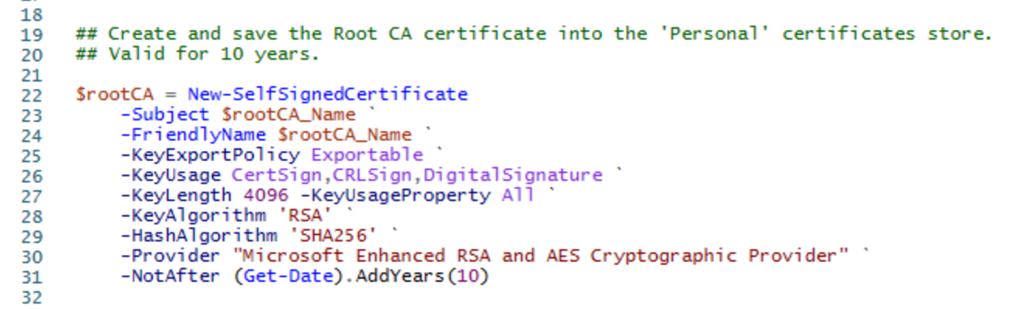 Dann wird das Root-Zertifikat erstellt. Dafür habe ich die folgenden Änderungen vorgenommen (Zeile 26).