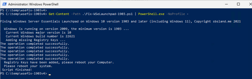 Mit dem Windows 10 21H1 Update funktioniert das Script in der aktuellen Version ohne Änderungen. Wird das Update über den WSUS oder Windows Update installiert, dann funktioniert der Windows Essentials Connector ohne Probleme und das Script ist nicht notwendig. Erfolgt das Update hingegen über eine ISO Datei, die es als Download bei Microsoft gibt, kann der Essential Connector im Anschuss über das Script repariert werden.