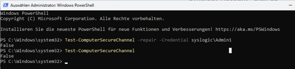 Test-ComputerSecureChannel (Rückgabe = False), korrekt wäre hier True