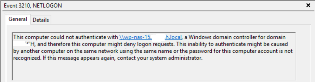 1. Windows meldet einen 3210, Netlogon Fehler mit dem Hinweis das die Authentifizierung mit dem “Windows Domain Controller” fehl geschlagen ist. In diesem Falle ist der “Windows Domain Controller” ein Synology NAS mit dem dem Synology Directory Server (Samba)