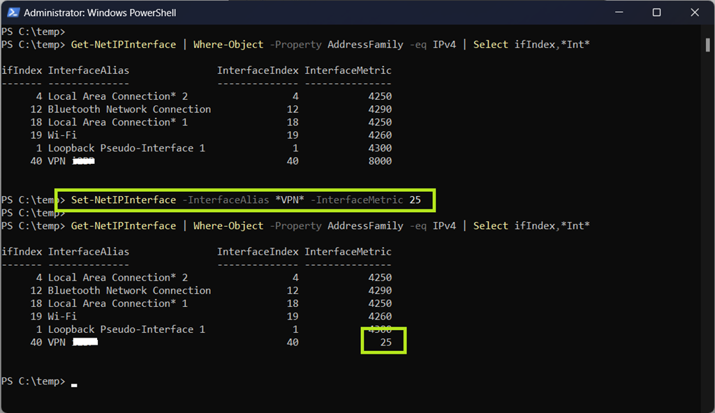 Abfragen und ändern der InterfaceMetric kann man über die folgenden beiden PowerShell-Befehle erreichen.