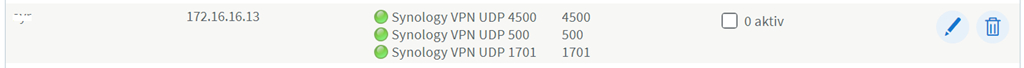 Hier der Screenshot einer FRITZ!Box mit den Weiterleitungen für L2TP, auf die interne IP-Adresse des Synology NAS (und damit dem VPN-Server) mit 172.16.16.13