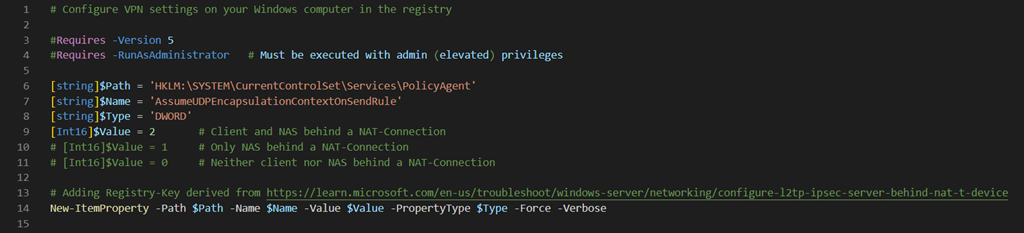 Microsoft beschreibt in diesem Artikel, mögliche Werte für die Konfiguration. Nach meiner Erfahrung befinden sich fast immer, sowohl der VPN-Client (also das Windows System) als auch das Synology NAS (und damit der VPN-Server) hinter einer mit NAT umgesetzten Umgebung. Darum habe ich den Wert 2 als Default in meinem Skript verwendet.