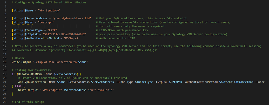• $L2tpPsk = Der im Synology VPN-Server hinterlegte Pre-Shared Key