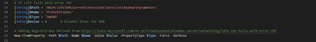 Für den Fall, dass der Aufbau des VPNs mit einem Fehler 787 fehlschlägt, ist ebenfalls in einer PowerShell-Sitzung mit erweiterten Rechten der unten stehende Code zur Ausführung zu bringen. Die dort beschriebene Änderung hat Microsoft ebenfalls in einem Artikel dokumentiert.