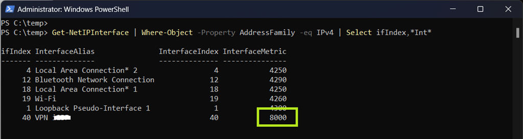 Die niedrige InterfaceMetric für den VPN-Netzwerkadapter spielt im Betrieb ohne VPN keine Rolle, da dann der Netzwerkadapter deaktiviert ist.