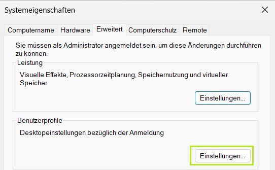 Systemeigenschaften / Erweitert/ Benutzerprofile/ Einstellungen …