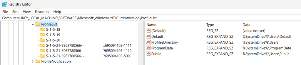 HKLM\SOFTWARE\Microsoft\Windows NT\CurrentVersion\ProfileList\S-1-5-21-1234567890-1234567890-1234567890-1112.bak