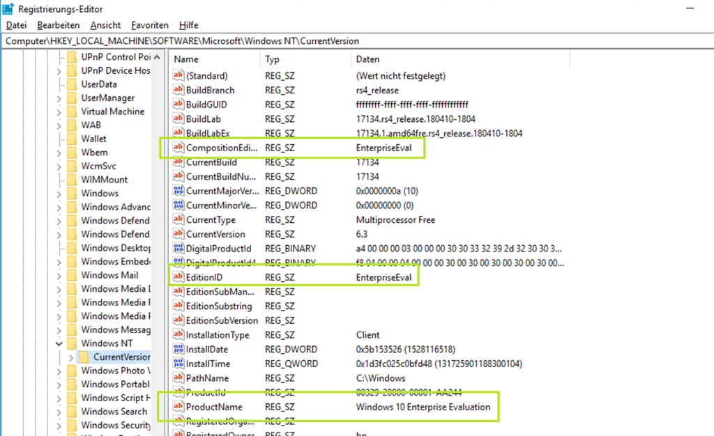 Die Version von Windows ist an drei stellen in der Registry hinterlegt und wenn diese dort geändert werden, dann ist ein anschließendes Upgrade mit dem ISO der Enterprise Edition möglich. Dazu sind die folgenden Schritte durch zu führen.