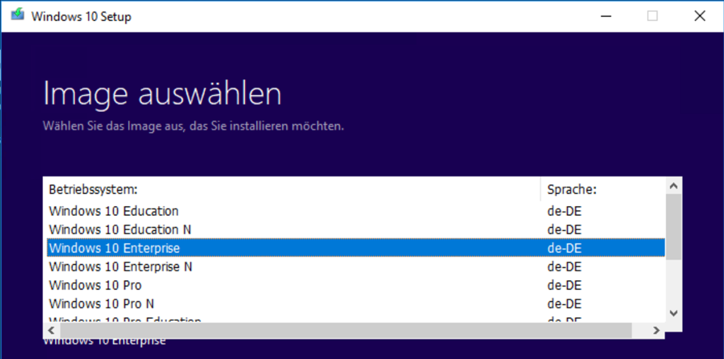 Danach KEINEN Neustart durchführen, sondern die setup.exe aus dem Windows 10 Enterprise Edition ISO starten und das Setup durchführen. Dabei das richtige Image auswählen …