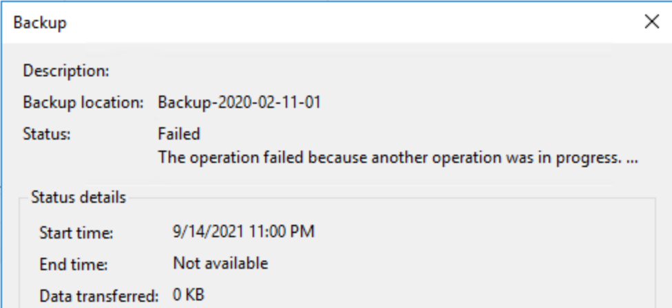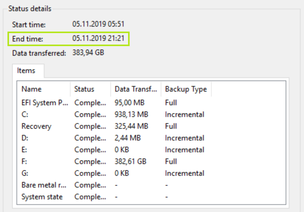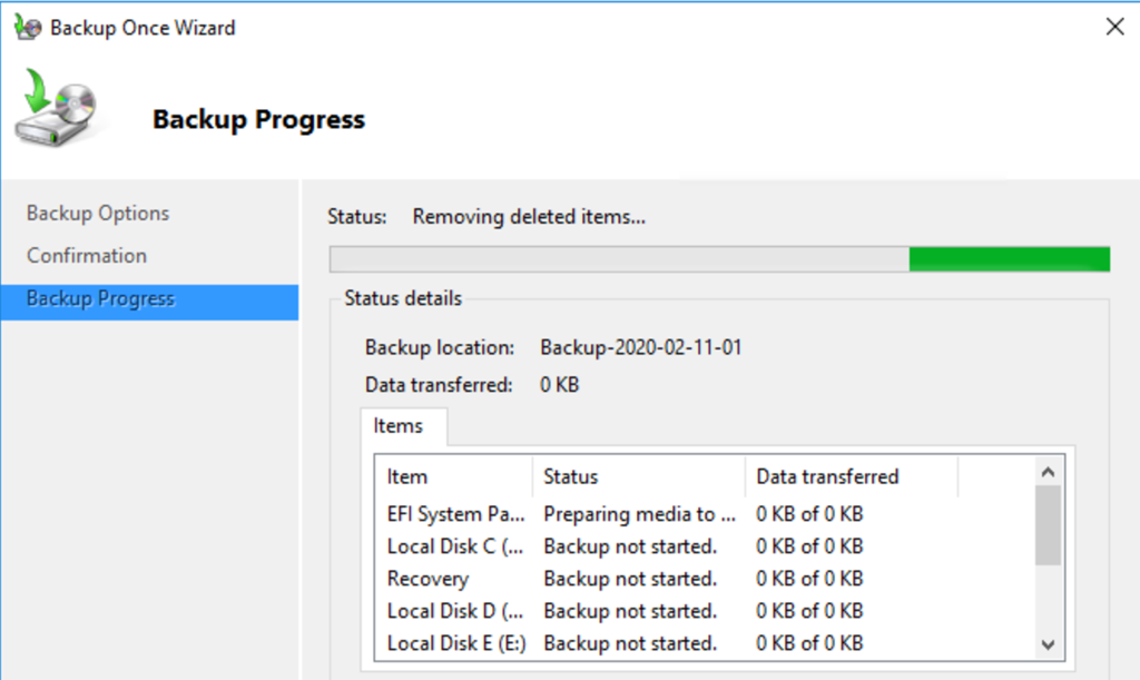 Wird Windows Backup das erste Mal ausgeführt, steht abhängig von der Konfiguration, möglicher Weise eine Vollsicherung des Servers an und das kann dauern und von den Einstellungen des Backup-Tasks sabotiert werden. Die Zeit, welche für ein Backup benötigt wird hängt im Wesentlichen von den Faktoren Performance, Größe und Anzahl der zu sichernden Dateien ab.