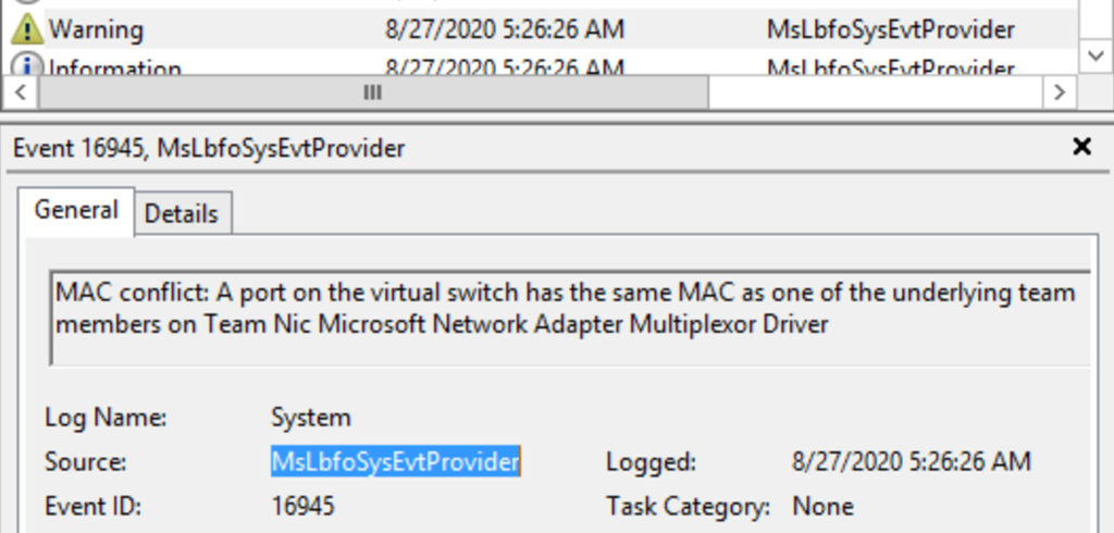 NIC Teaming: Warning 16945 MsLbfoSysEvtProvider