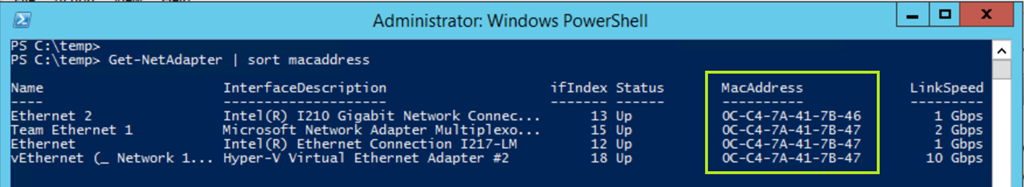 Nach der Änderung sieht die Vergabe der MAC-Adressen wie folgt aus und die Warnung 16945 wird beim nächsten Neustart nicht mehr ins Eventlog geschrieben.