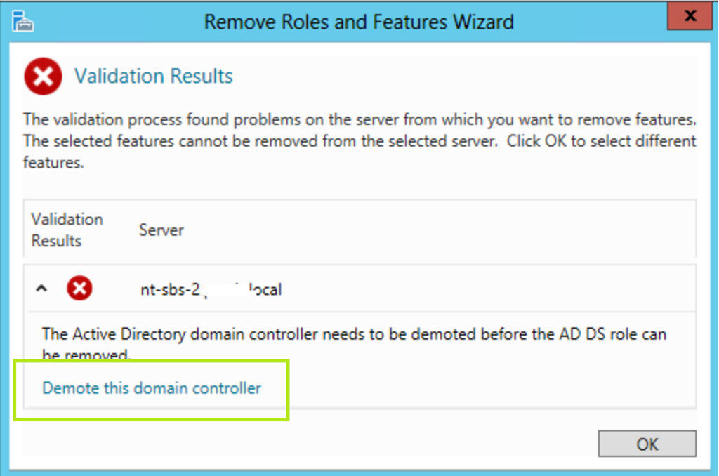 Der Remove Roles and Features Wizard bietet einem danach die Möglichkeit den Server herunterzustufen.