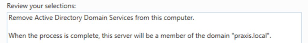 Alle Informationen dazu kann man bei Microsoft hier nachlesen. Obwohl ein großer Freund von PowerShell, führe ich diesen Schritt immer in der GUI durch. Dazu im Server Manager einfach die Rolle Active Directory Domain Services entfernen.