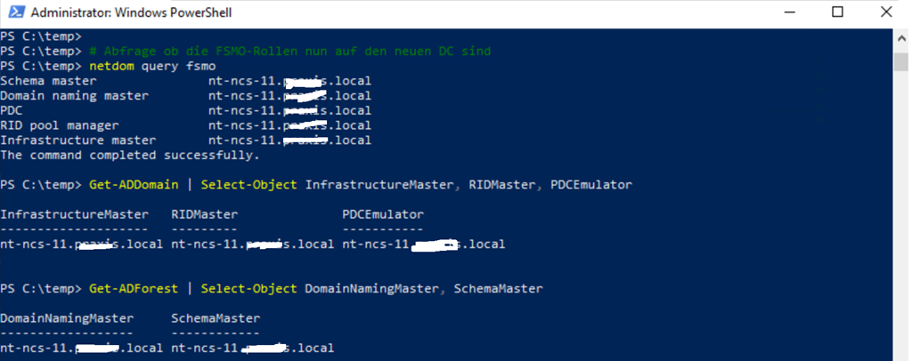 # Abfrage ob die FSMO-Rollen nun auf den neuen DC sind