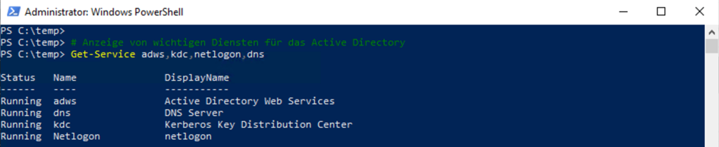 Abschließend schaue ich immer, ob die wichtigen Active Directory Dienste laufen.
