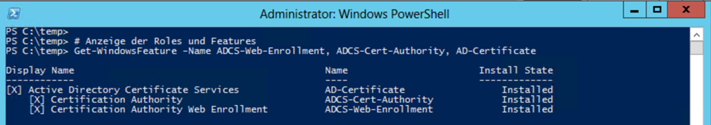 Get-WindowsFeature -Name ADCS-Web-Enrollment, ADCS-Cert-Authority, AD-Certificate