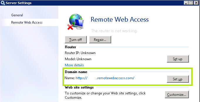 Start des Windows Small Business Server 2011 Dashboard und Auswahl von Server Settings / Remote Web Access / Domain name / Set up