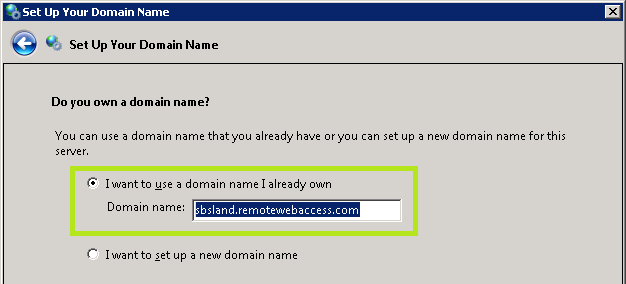 Nun erscheint der Set Up Your Domain Wizard (Assistant) und mit Next geht es weiter zum Dialog um den Domain name (Domänen Name) zu ändern. Hier ist es wichtig die Option Use another domain name or domain name service provider aus zu wählen und dann auf Next zu klicken. Im nun folgenden Dialog wird wieder der alte Name der Domain eingetragen, z.B. sbsland.remotewebaccess.com und mit Next bestätigt