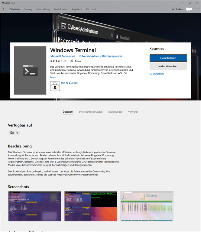 Zur Microsoft Build 2020, wurde das Windows Terminal in der Version 1.0 veröffentlicht. Der Download erfolgt über den Microsoft Store.