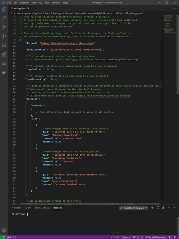 Die Einstellungen basieren auf einer JSON-Konfigurationsdatei (settings.json), die sich zum Beispiel mit Visual Studio Code anpassen lässt.