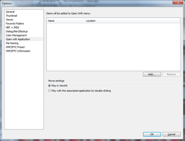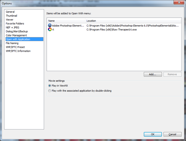 Im Normalfall muss sich nun durch anklicken der Option ”Add …” ein weiteres Kontektmenü öffnen welches Anwendungen vorgibt und zusätzlich durch einen Dateidialog weitere hinzufügen läßt. Das funktioniert allerdings nicht in der Kombination Windows 7 und Nikon ViewNX. Das Anklicken der Option bleibt schlicht weg ohne Aktion.